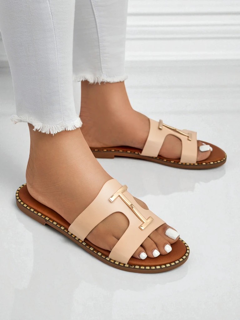 - Damen Sandalen aus Ökoleder mit flacher Sohle, trendigem Flechtdesign und goldenem Ornament. Stilvoll und bequem, perfekt für den Sommer. Die leichte Konstruktion und das elegante Detail verleihen jedem Alltagsoutfit einen Hauch von Chic.