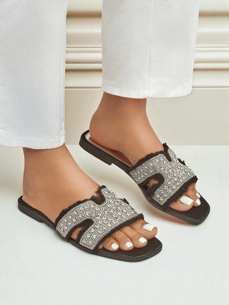- Flache Damenpantoletten aus Kunstleder, verziert mit funkelnden Strasssteinen. Stylisch und bequem, perfekt für den Sommer und besondere Anlässe. Sie verleihen jedem Outfit Glanz und sorgen den ganzen Tag über für Komfort.