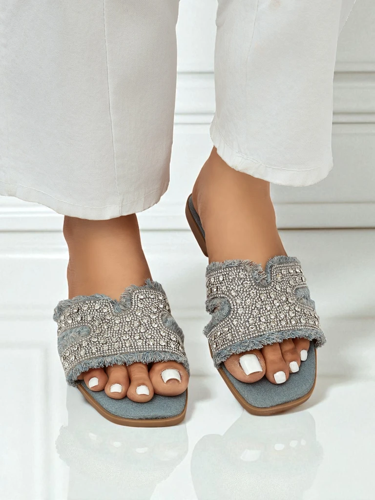 - Flache Damen-Sandalen aus Kunstleder, verziert mit funkelnden Strasssteinen. Stilvoll und bequem, perfekt für den Sommer und besondere Anlässe. Sie verleihen jedem Outfit Glanz und bieten den ganzen Tag Komfort.