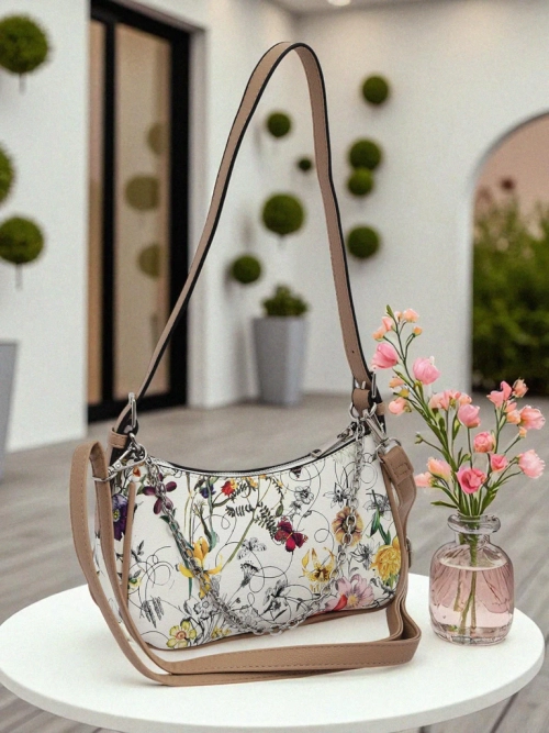 - Kleine Handtasche aus Ökoleder mit Blumenmuster. 1 Fach, Reißverschluss, dekorative Kette. Verstellbarer, abnehmbarer Gurt ermöglicht unterschiedliche Trageweisen. Stilvoll, leicht und praktisch – perfekt für den Alltag und besondere Anlässe.
