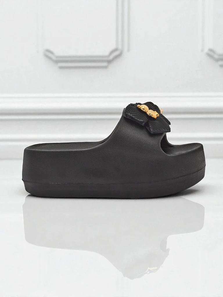 - Tolle Damen-Gummi-Flip-Flops mit Plateau. Sie verfügen über eine dekorative Schleife am Obermaterial. Die perfekte Wahl für den Urlaub!