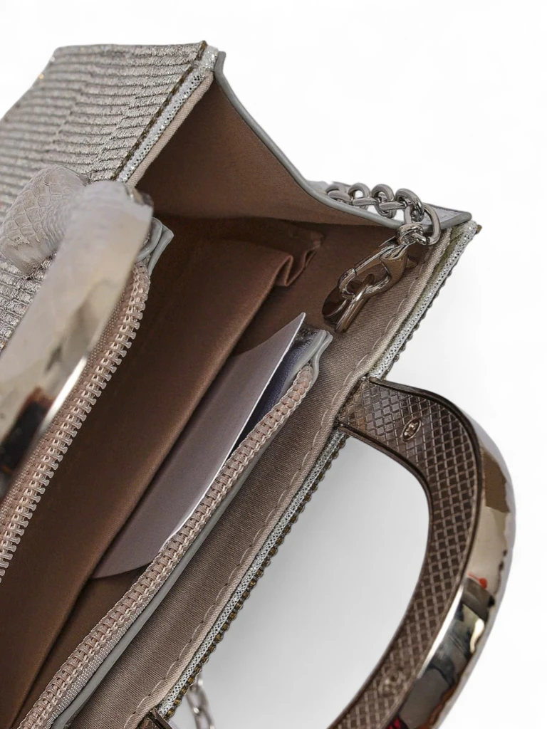 - Elegante Clutch mit glänzenden Zirkonia-Steinen, 1 Fach, mit Reißverschluss. Stilvolle Henkel und eine dekorative Kette verleihen Chic. Ideal für besondere Anlässe – strahlen Sie mit Klasse!