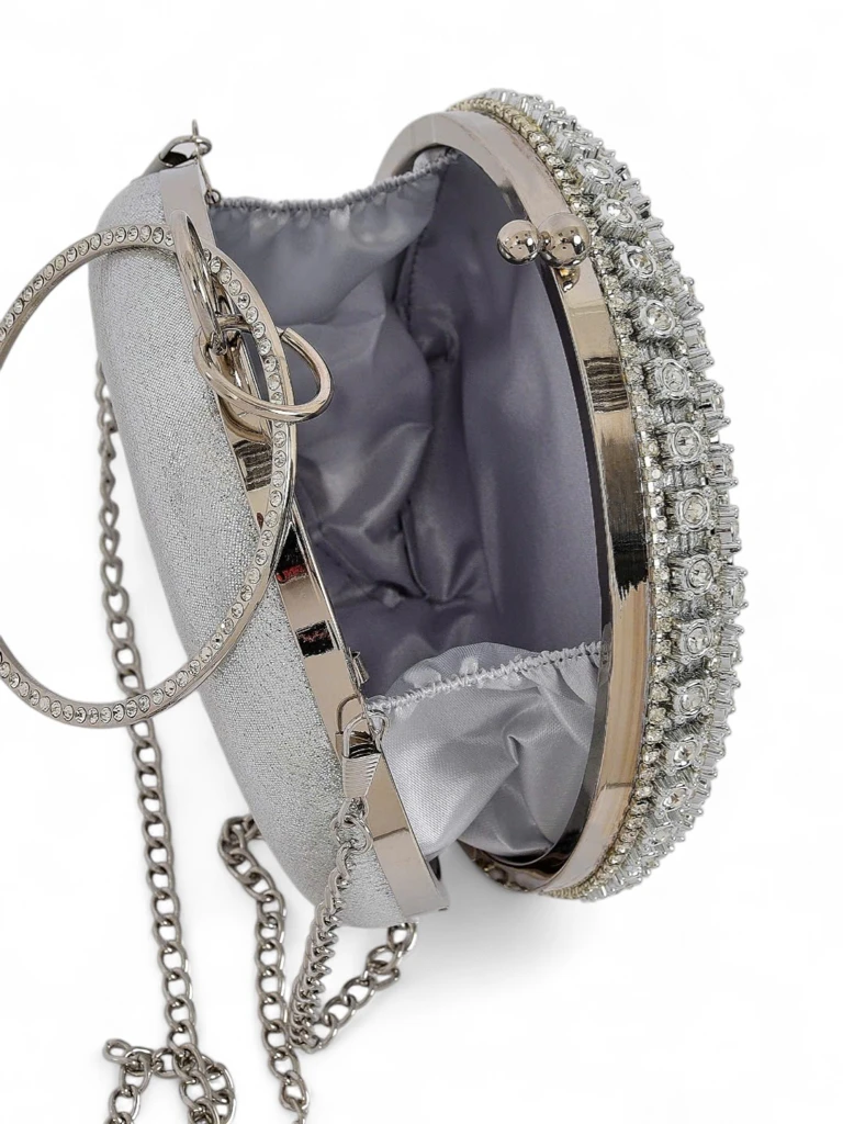 - Runde Clutch mit aufwendig verzierter Oberfläche mit Zirkonia. Dank der Kette kann sie über der Schulter getragen werden. Elegant, ausdrucksstark und geschaffen, um im Dunkeln zu glänzen.