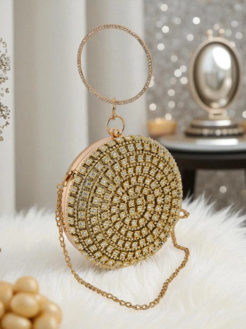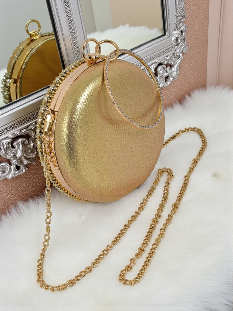 • Runde Clutch mit aufwendig verzierter Oberfläche mit Zirkonia. Dank der Kette kann sie über der Schulter getragen werden. Elegant, ausdrucksstark und geschaffen, um im Dunkeln zu glänzen.