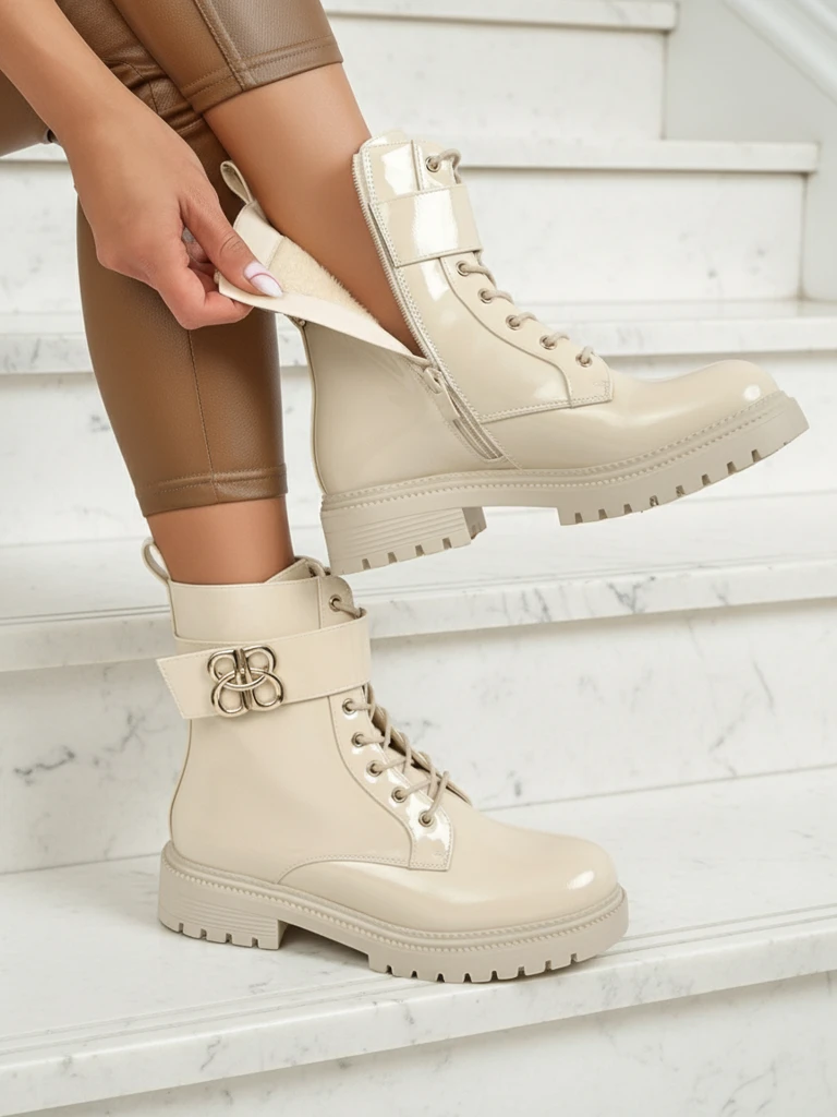 Die stilvollen Ariadne Stiefeletten sind ein außergewöhnliches Angebot für Frauen, die Wert auf eine Kombination aus Komfort, modernem Design und Umweltbewusstsein legen. Sie sind aus hochwertigem Öko-Leder gefertigt und eine ausgezeichnete Alternative zu traditionellen Lederprodukten. Dieses Material wird mit modernen, umweltfreundlichen Technologien hergestellt und ist nicht an Tieren getestet. Das mit einer strapazierfähigen PU-Beschichtung versehene Öko-Leder garantiert Kratz- und Feuchtigkeitsbeständigkeit und ermöglicht eine komfortable Nutzung während der gesamten Herbst- und Wintersaison.Die beige Farbe der Ariadne Stiefeletten ist ein Synonym für Vielseitigkeit – sie passt perfekt zu den aktuellen minimalistischen Trends und neutralen Farben, die in der Mode seit mehreren Saisons dominieren. Die quadratische Schnalle in Goldfarbe am Riemen verleiht dem Ganzen Eleganz und ist ein subtiler Schmuckakzent. Das Modell verfügt über einen praktischen Reißverschluss und eine bequeme Schnürung, die ein schnelles Anziehen und Anpassen an den Fuß erleichtern.Ariadne Stiefeletten sehen in klassischen und lässigen Stilisierungen großartig aus. Sie können sie kombinieren mit:1. Röhrenjeans und Oversize-Pullover – das ideale Set für den täglichen Ausflug in die Stadt.2. Einem eleganten Midirock und Rollkragenpullover – Sie kreieren einen modischen Look für das Büro oder ein Treffen mit Freunden.3. Einer Lederjacke und einem kontrastierenden Kleid – eine Anspielung auf den urbanen Streetstyle in einer femininen Version.Dank der soliden, geriffelten Sohle und dem weichen Innenraum sind die Schuhe auch bei langen Spaziergängen stabil und bequem. Die runde Spitze bietet Komfort für die Zehen und schränkt die Bewegungsfreiheit nicht ein, und der profilierte Absatz hebt die Silhouette, ohne die Beine zu belasten.Pflegehinweise: Es wird empfohlen, die Schuhe regelmäßig mit einem weichen, leicht feuchten Tuch abzuwischen und spezielle Pflegeprodukte für Öko-Leder zu verwenden. Bewahren Sie die Stiefeletten an einem luftigen Ort auf, am besten im Originalkarton oder in Beuteln, um Verformungen zu vermeiden. Vermeiden Sie die Lagerung in direktem Sonnenlicht und in der Nähe von Wärmequellen.Ariadne Stiefeletten passen perfekt zum aktuellen Trend von gedämpften Farben, massiven Sohlen und subtilen Schmuckdetails. Sie sind eine großartige Ergänzung sowohl für alltägliche als auch für raffiniertere Stilisierungen und sorgen dafür, dass sich jede Frau modisch und wohl fühlt.