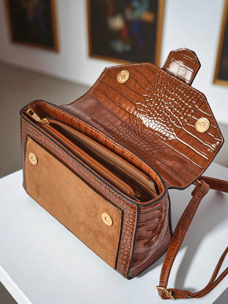 Die Callista Handtasche vereint raffinierten Stil mit einem modernen Ansatz zur Nachhaltigkeit. Sie ist aus hochwertigem Öko-Leder und Wildleder-Öko-Leder gefertigt, die nicht nur die natürliche Textur nachbilden, sondern auch umweltfreundlich sind. Der Produktionsprozess dieser Materialien basiert auf der Reduzierung des Einsatzes von Chemikalien und des Wasserverbrauchs, was ihren umweltfreundlichen Charakter bestätigt. Die Wildlederfront der Handtasche besticht durch ihre weiche Haptik, während die Oberflächen aus Öko-Leder mit Krokodilmuster der gesamten Form Luxus und Charakter verleihen. Goldene Beschläge und ein solider Reißverschluss in Kombination mit einem Magneten sorgen für die Sicherheit der aufbewahrten Gegenstände. Das Innere der Handtasche ist durchdacht gestaltet - zahlreiche Taschen und die Aufteilung des Raums ermöglichen eine bequeme Organisation der wichtigsten Accessoires wie Telefon, Geldbörse oder Schlüssel. Das Modell Callista ist für Frauen gedacht, die Wert auf Komfort, Ästhetik und moderne Lösungen legen. Die wichtigsten Vorteile der Callista Handtasche: - Die leichte Konstruktion und die kompakte Größe (24x16x10 cm) machen sie perfekt für alltägliche Ausflüge und Treffen. - Umweltfreundliche Materialien garantieren Haltbarkeit, einfache Reinigung und Widerstandsfähigkeit gegen Beschädigungen. - Die universelle, dunkelbraune Farbe passt zu den aktuellen Modetrends und zu vielen Stilen. Styling-Vorschläge: 1. Casual-Set: passende Jeans, ein weißes T-Shirt, ein karamellfarbener Mantel und die Callista Handtasche - ein idealer Look zum Einkaufen und für ein Treffen mit Freunden. 2. Business Chic: ein Bleistiftrock, eine Seidenbluse und High Heels - eine elegante Handtasche vervollständigt den Office-Look für ein wichtiges Geschäftstreffen. 3. Boho-Stil: ein wallendes Kleid, Cowboystiefel und eine lange Strickjacke - Callista verleiht jedem Sommer-Styling Leichtigkeit und Modernität. So pflegen Sie Ihre Handtasche: - Mit einem feuchten Tuch und einem milden Reinigungsmittel für Öko-Leder und Wildleder reinigen. - An einem luftigen Ort aufbewahren, am besten mit einer Füllung im Inneren, die die Form schützt. - Vermeiden Sie längere Sonneneinstrahlung und Kontakt mit Wasser. Die Callista Handtasche passt zu den neuesten Trends der Saison - die Kombination aus klassischem Braun und dem Duo aus Wildlederstruktur und Leder mit Krokodilimitation ist auf den internationalen Laufstegen zu sehen. Ein Must-Have für jede moderne Frau, die Wert auf Stil und Funktionalität legt.