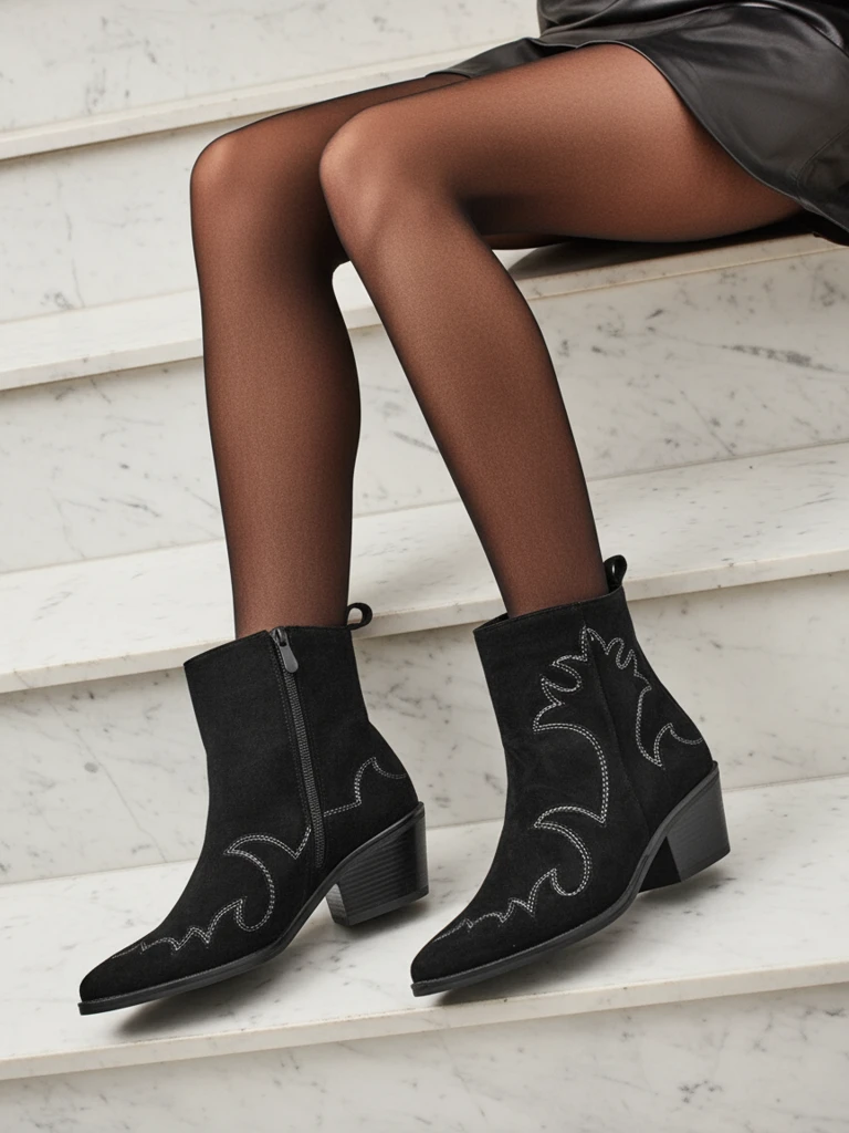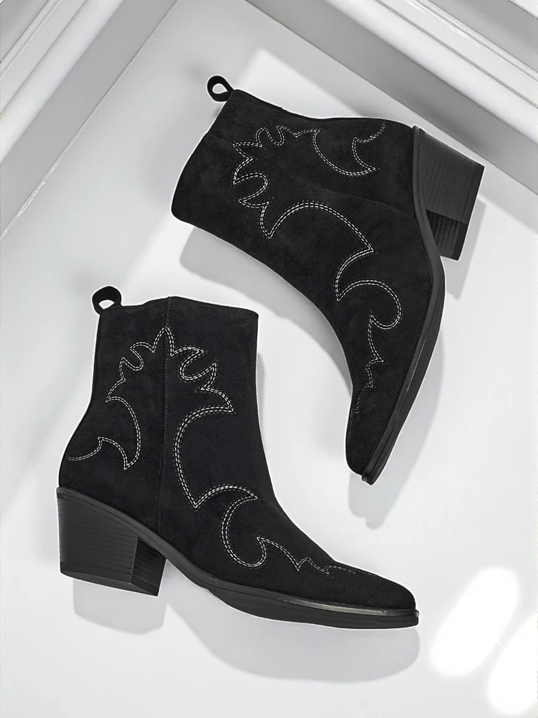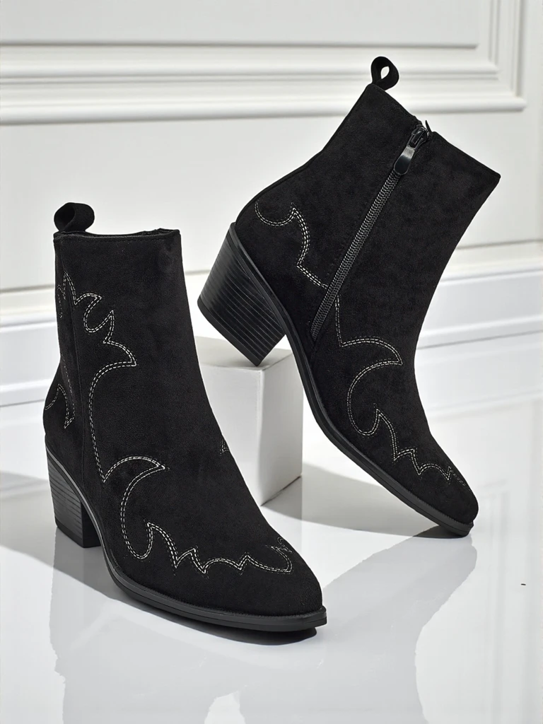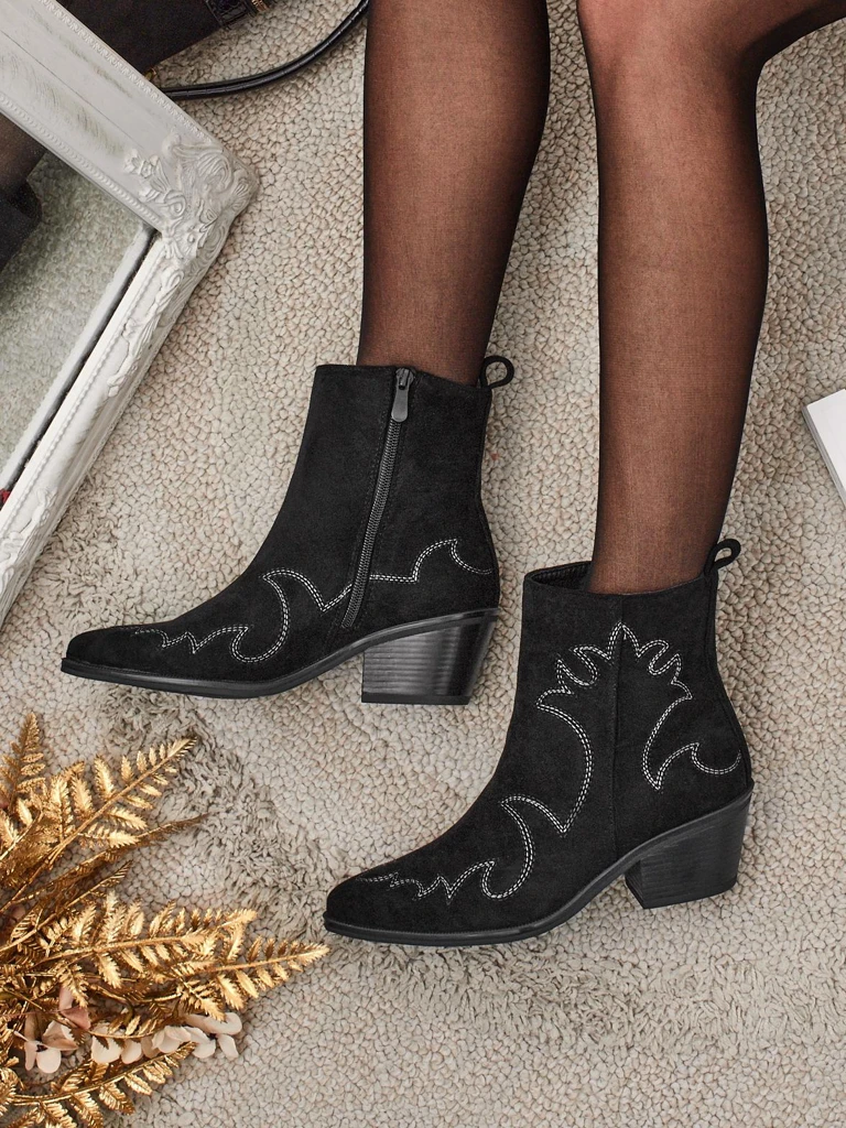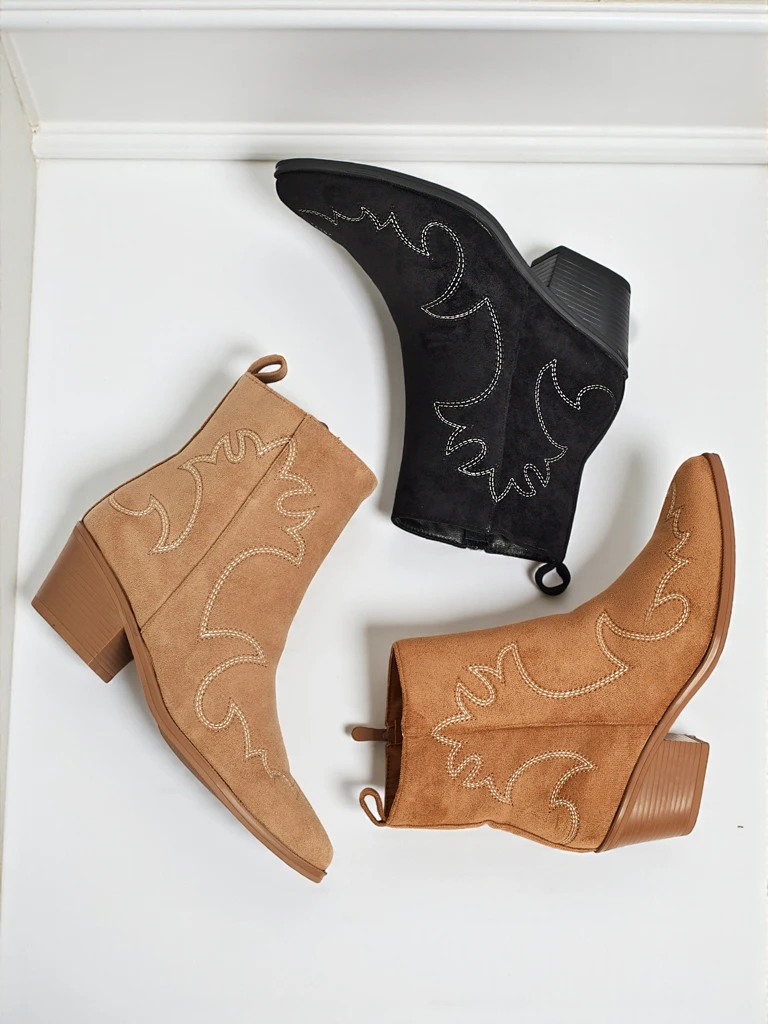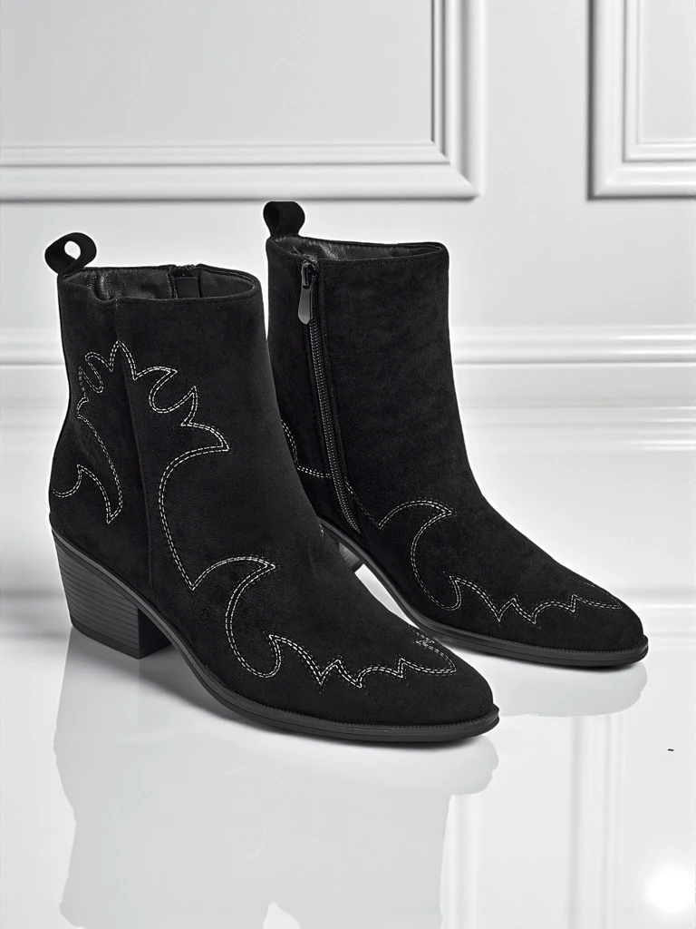 - Velvet Ash Damen Cowboystiefel – mit Absatz, aus Öko-Wildleder gefertigt. Spitze Zehenpartie, Reißverschluss, ohne Isolierung. Eine modische Wahl für jede Jahreszeit – Komfort und Stil.