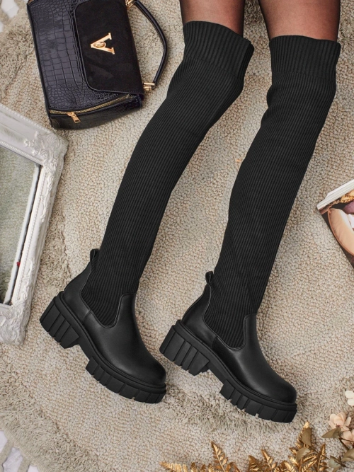 • Stylische Damen Overknee-Stiefel mit flachem Absatz. Der Schaft ist aus elastischem Stoffmaterial mit Einsätzen aus Öko-Leder gefertigt, innen befindet sich eine Stoffeinlegesohle. Schlupfmodell. Ideal für alltägliche Herbstoutfits!