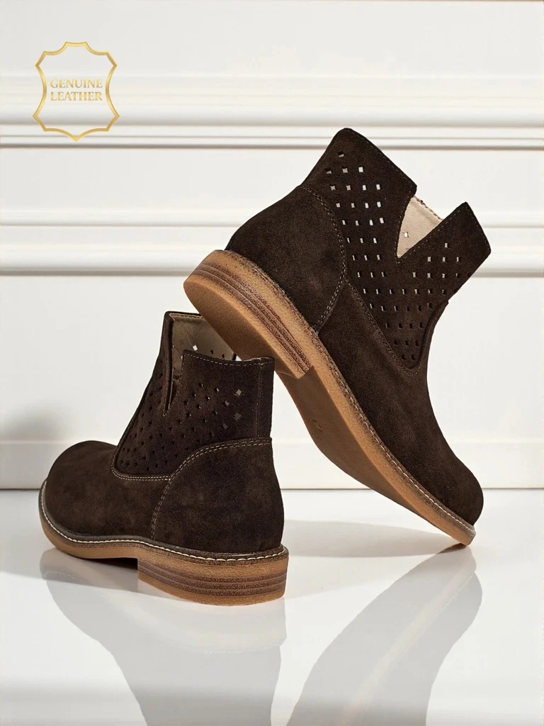 • Stiefeletten mit flacher Sohle - Stil und Komfort in einem. Der Ausschnitt am Knöchel und der Reißverschluss erleichtern das Anziehen. Komplett aus natürlichem Wildleder und Naturleder im Inneren gefertigt. Dieses Modell verleiht Ihnen Selbstvertrauen!