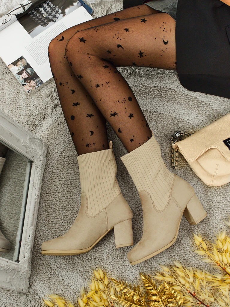 - Bequeme Stiefeletten mit Blockabsatz, gefertigt aus Wildlederimitat. Modell zum Hineinschlüpfen mit einem sockenähnlichen Einsatz. Mit einer zarten Fütterung in Form von Fell.