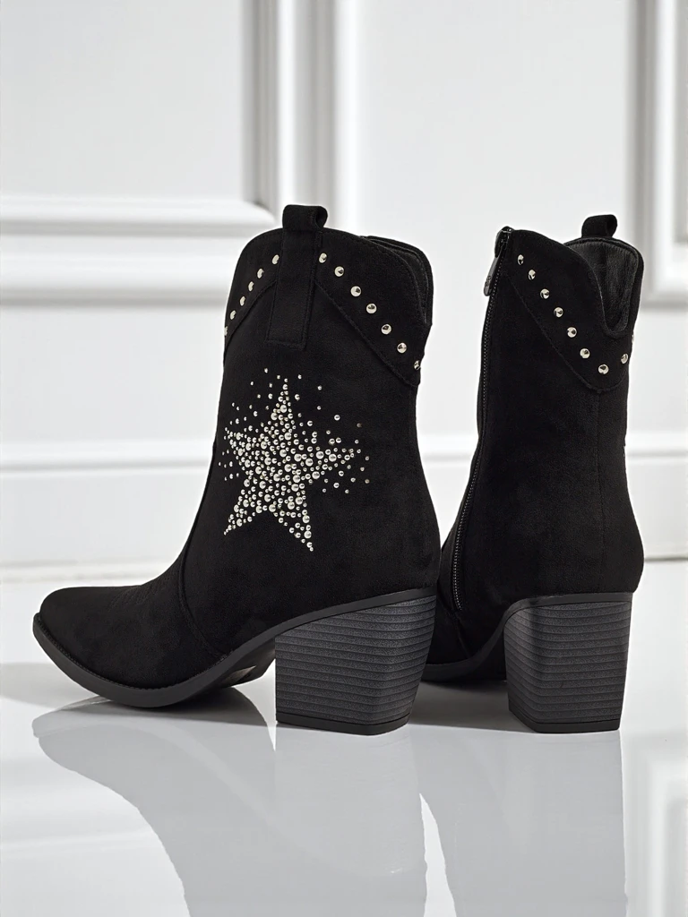 • Cowboystiefel-ähnliche Stiefeletten mit Absatz, gefertigt aus ökologischem Wildlederimitat. Textile Einlegesohle, die Schuhe werden mit einem Reißverschluss mit einem dekorativen Strassstern geschlossen. Passen zu vielen femininen Stilen!