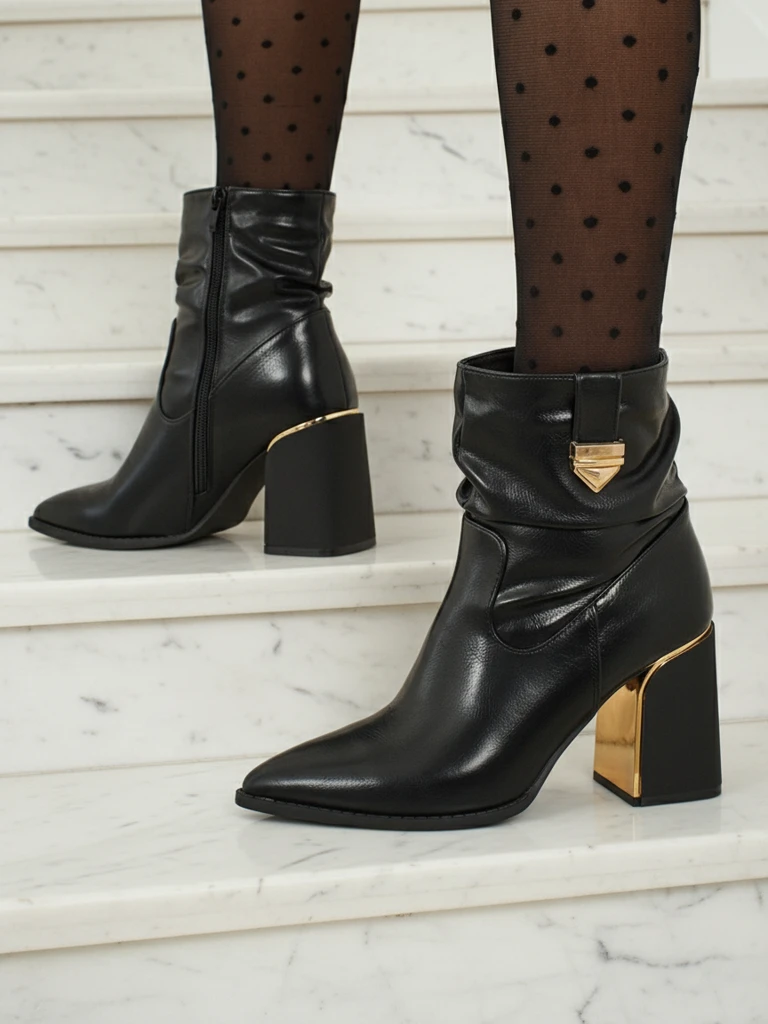 - Bequeme Stiefeletten mit Blockabsatz aus Öko-Leder. Das Modell wird mit einem Reißverschluss geschlossen und ist mit einer goldenen Verzierung versehen. Es hat eine zarte Isolierung in Form von Fell.