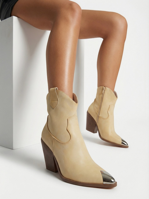 - Stiefeletten im Cowboy-Stil mit Absatz, gefertigt aus ökologischem Leder. Textile Einlegesohle, die Schuhe werden mit einem Reißverschluss mit dekorativer Spitze geschlossen. Passen zu vielen femininen Stilen!