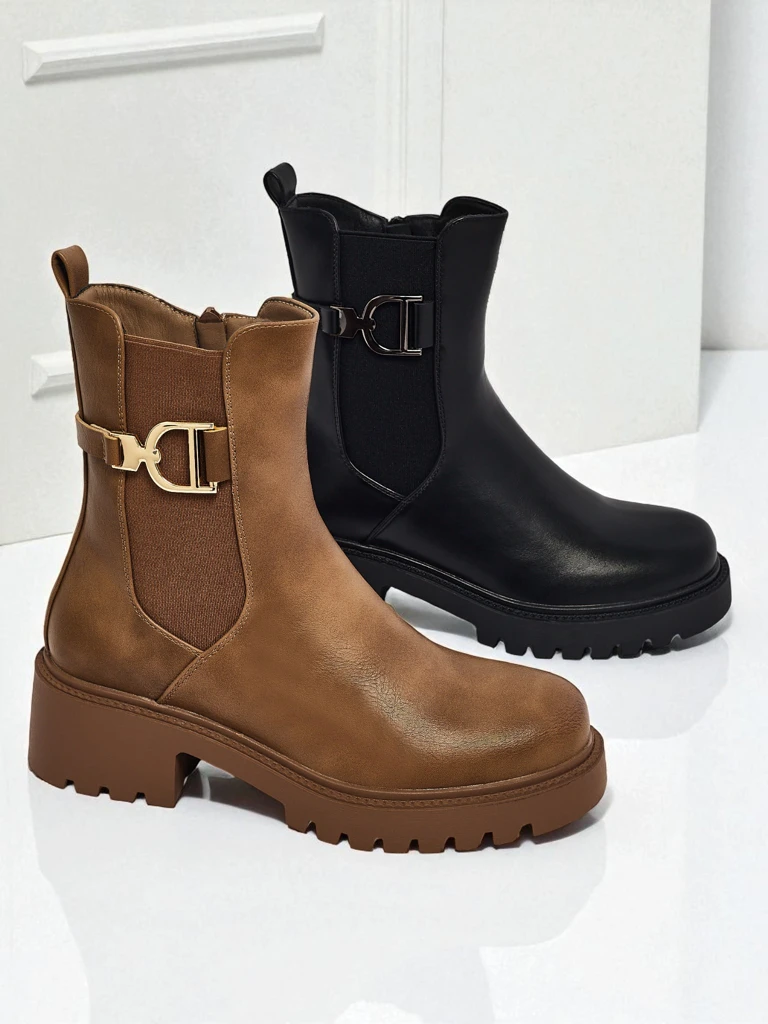 • Damenstiefeletten aus Öko-Leder mit Reißverschluss und elastischem Einsatz an der Seite. Modell mit dickerer Sohle. Mit Stoffeinlegesohle. Bequem und stilvoll, ideal für den Herbst!