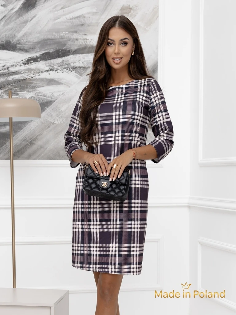 - Damen Mini Kleid. Modell mit 3/4 Ärmeln und rundem Ausschnitt. Verziert mit einem Karomuster, hat Taschen. Ein Must-Have in Ihrem Kleiderschrank!