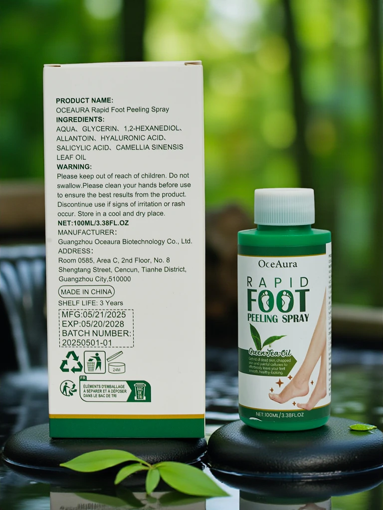 OceAura Rapid Foot Peeling Spray to nowoczesny produkt, który w sposób szybki i skuteczny zadba o Twoje stopy. Głównym składnikiem aktywnym jest olejek z zielonej herbaty, znany ze swoich właściwości nawilżających oraz antyoksydacyjnych. Produkt zawiera również kwas hialuronowy, który wspomaga nawilżenie, a także kwas salicylowy, który skutecznie usuwa martwy naskórek. Dzięki zawartości alantoiny, spray łagodzi podrażnienia, co czyni go idealnym rozwiązaniem dla osób z wrażliwą skórą.