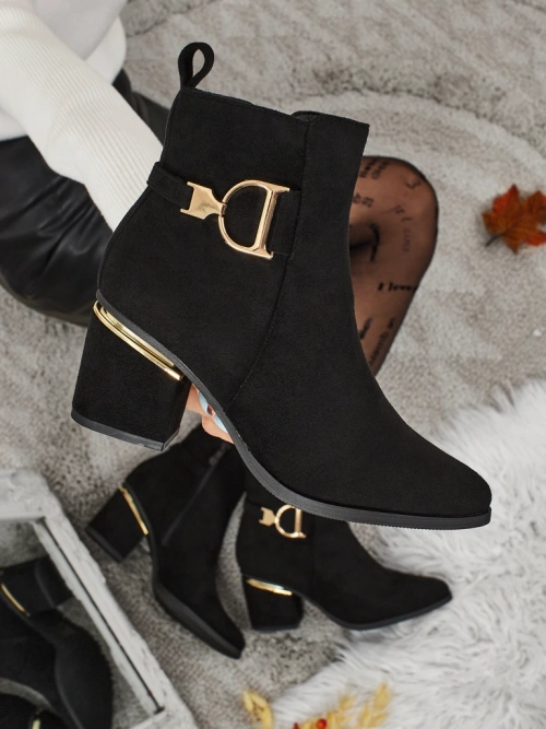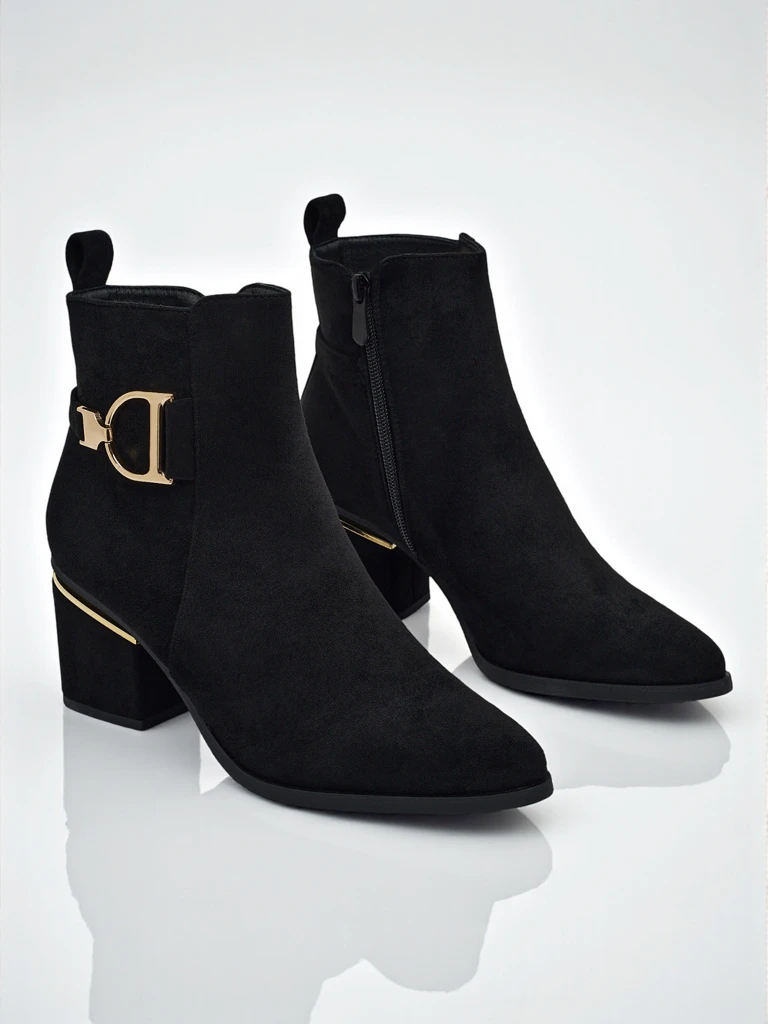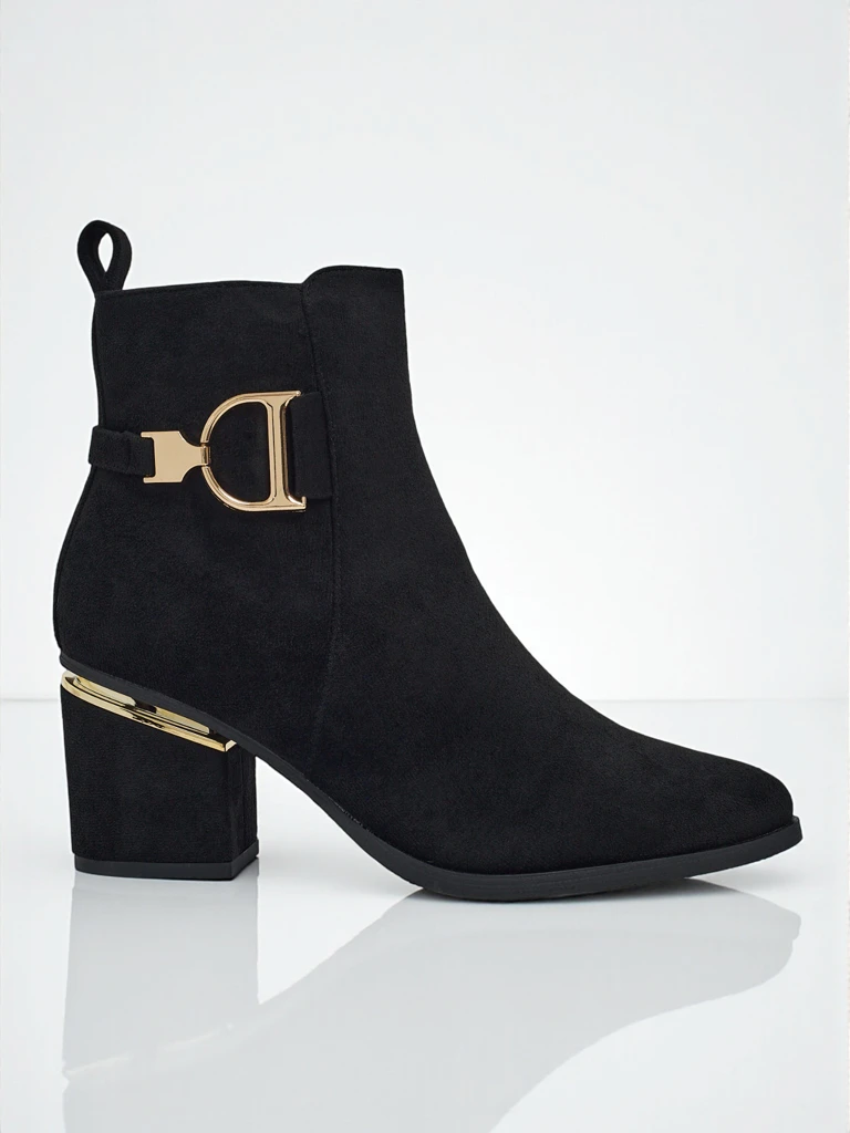 • Bequeme Stiefeletten mit Blockabsatz, gefertigt aus Wildlederimitat. Das Modell wird mit einem Reißverschluss geschlossen. Das Modell ist leicht mit Fell gefüttert und hat eine goldene Verzierung an der Seite des Schafts. Die ideale Wahl für den Herbst!