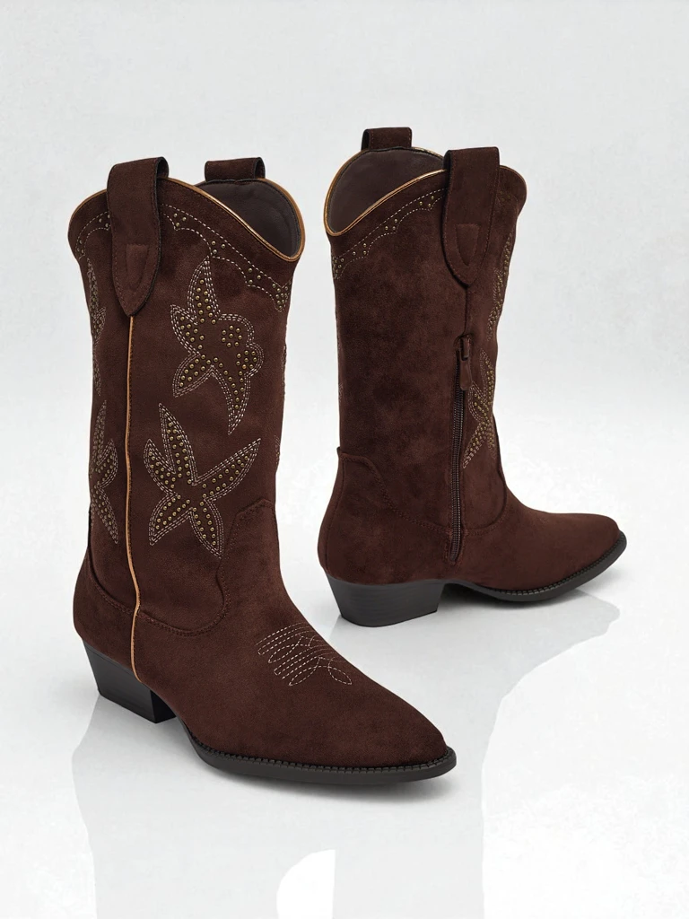 - Cowboystiefel mit flachem Absatz, gefertigt aus Wildleder-Öko-Leder. Die Schuhe werden mit einem Reißverschluss geschlossen und haben eine Füllung aus Fell. Sie passen zu vielen femininen Stilen!