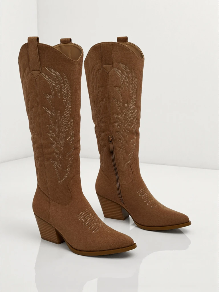 - Cowboystiefel mit Absatz, gefertigt aus Wildleder-Öko-Leder. Die Schuhe werden mit einem Reißverschluss geschlossen und haben eine Stofffüllung. Sie passen zu vielen femininen Stilen!