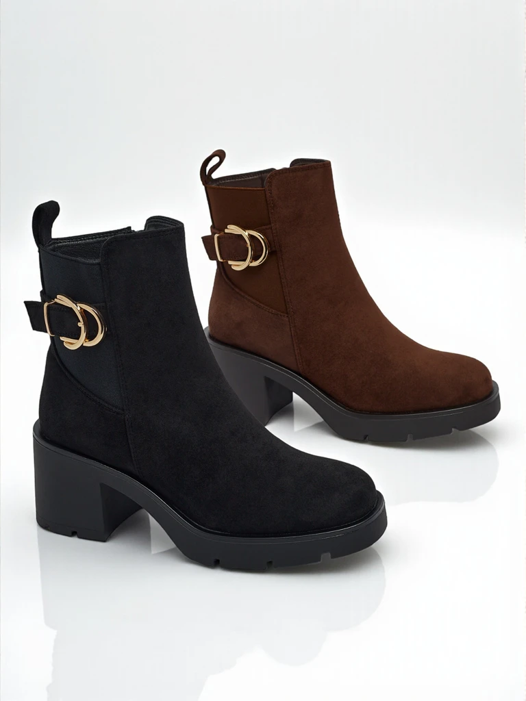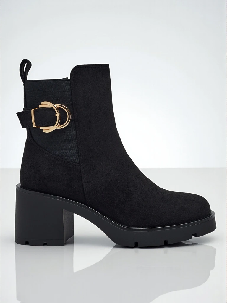 • Bequeme Stiefeletten mit Blockabsatz, gefertigt aus Wildlederimitat. Das Modell wird mit einem Reißverschluss geschlossen. Das Modell ist leicht mit Fell gefüttert und hat eine goldene Verzierung an der Seite des Schafts. Die ideale Wahl für den Herbst!