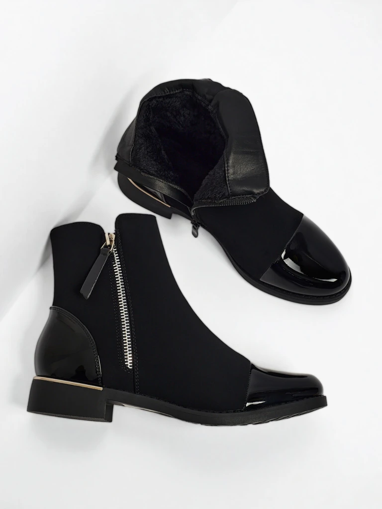 • Fantastische Damen Stiefeletten mit dicker Sohle, gefertigt aus einer Kombination von lackiertem und mattem Öko-Leder. Das Innere aus zartem Fell garantiert Wärme an kälteren Tagen. Das Modell wird mit einem Reißverschluss geschlossen.