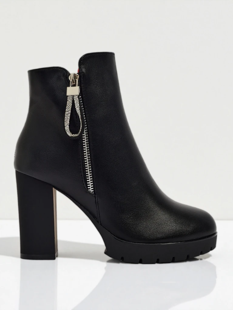 • Bequeme Stiefeletten mit Blockabsatz aus Öko-Leder. Das Modell wird mit einem Reißverschluss mit Verzierung am Schieber geschlossen. Das Modell ist leicht mit Fell gefüttert. Die ideale Wahl für den Herbst!
