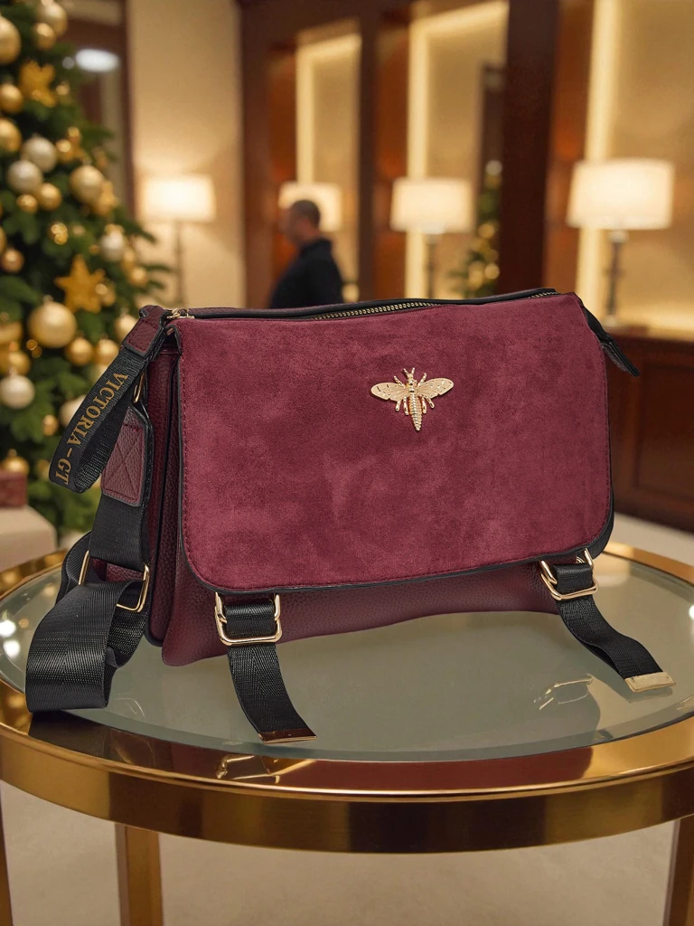 - Kleine Handtasche aus einer Kombination von Öko-Leder und Öko-Wildleder. 3 Fächer, 4 Taschen, Reißverschluss und verstellbarer Riemen. Stil und Funktionalität in Perfektion.
