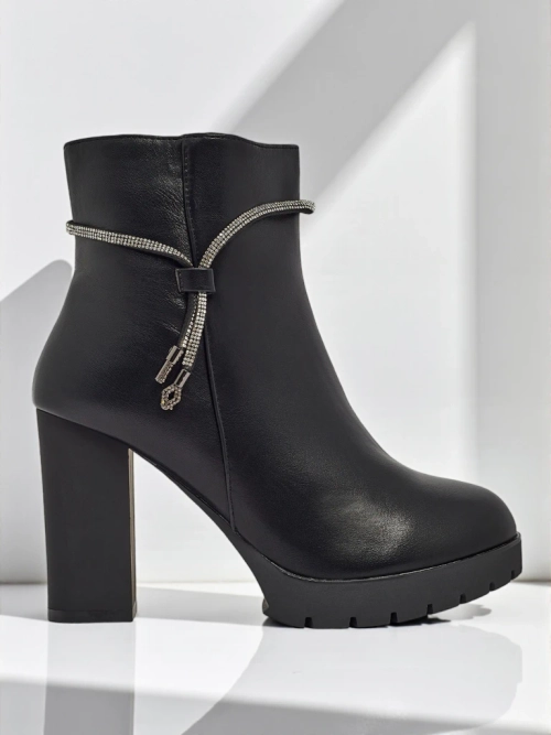 • Bequeme Stiefeletten mit Blockabsatz aus Öko-Leder. Das Modell wird mit einem Reißverschluss geschlossen. Das Modell ist leicht mit Fell gefüttert und hat einen dekorativen Reißverschluss mit Zirkonia. Die ideale Wahl für den Herbst!