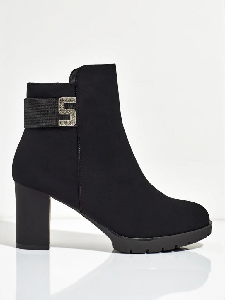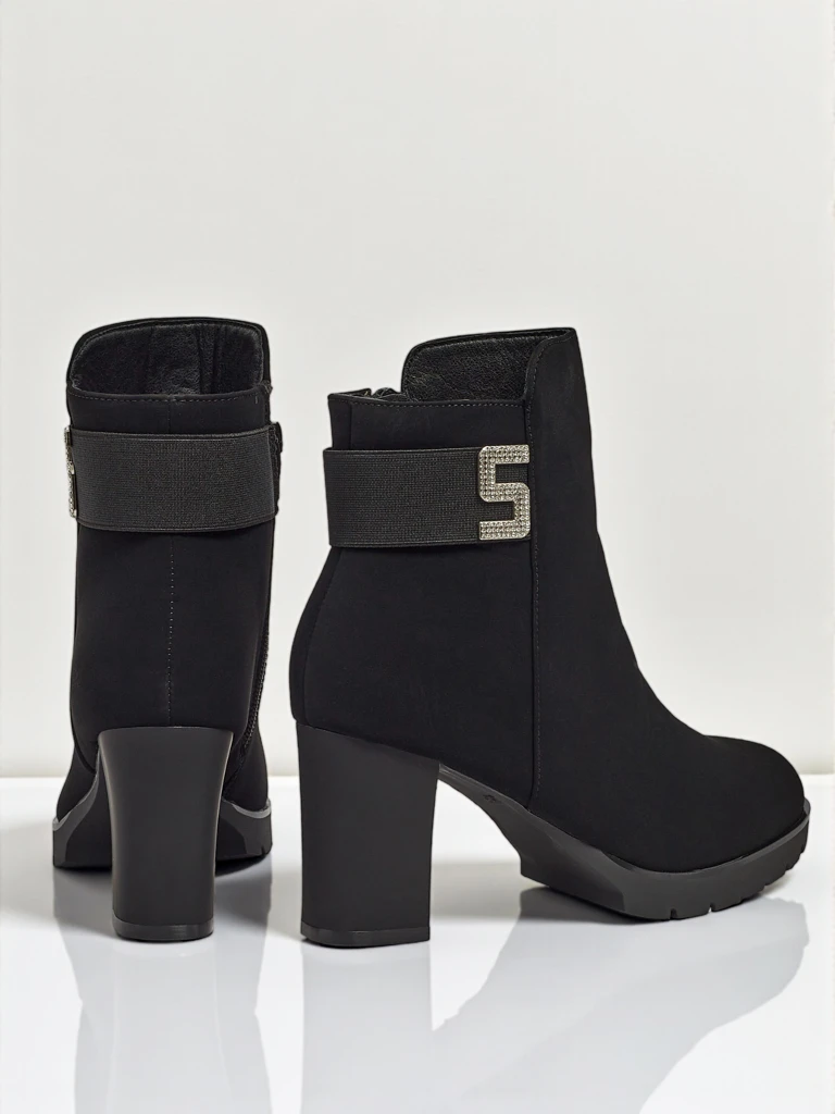 - Bequeme Stiefeletten mit Blockabsatz, gefertigt aus mattem Öko-Leder. Das Modell wird mit einem Reißverschluss geschlossen. Das Modell ist leicht mit Fell gefüttert und hat eine Verzierung mit Zirkonia. Die ideale Wahl für den Herbst!