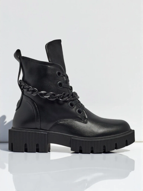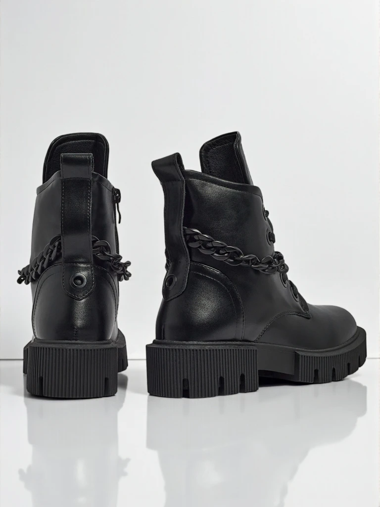 - Damenstiefeletten aus Öko-Leder mit Reißverschluss, dekorativer Kette und runder Spitze, zusätzlich mit Fell gefüttert – Modernität, Komfort und Stil in einem.