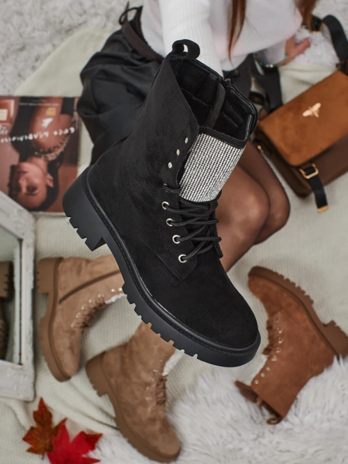 • Damenstiefeletten aus ökologischem Wildlederimitat mit Reißverschluss, dekorativer Schnürung und runder Spitze. Zusätzlich mit einer wärmenden Stoffeinlegesohle ausgestattet. Modernität, Komfort und Stil in einem. Der vordere Teil des Schafts ist zusätzli