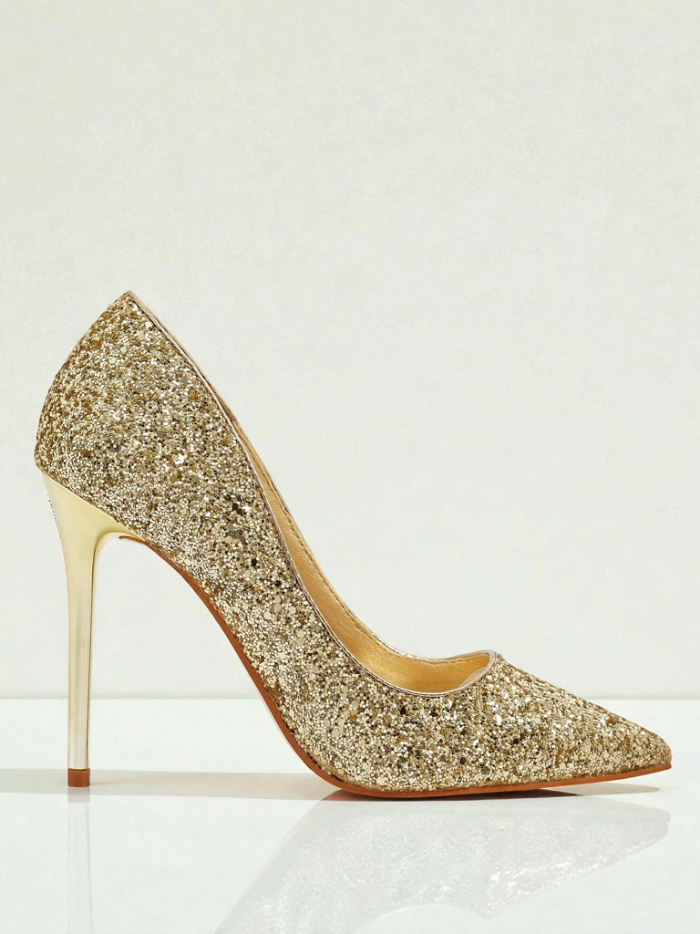 - Damenpumps aus Öko-Leder mit Stilettoabsatz und spitzer Spitze. Mit einer Schicht aus dickem, glänzendem Brokat überzogen, verbinden sie Eleganz mit subtilem Glanz, ideal für besondere Anlässe.