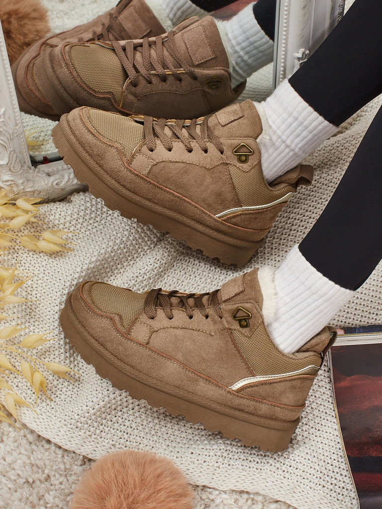 - Damen-Sneakers mit warmer Fütterung und flacher Sohle. Der Schnürschuh ist aus Wildlederimitat gefertigt. Innen weiches Fell. Ein tolles Accessoire für Ihre winterlichen Casual-Outfits!