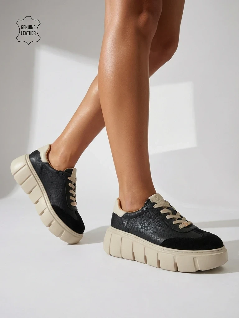 - Wunderschöne Damen-Sneakers auf einer Plateausohle – die perfekte Kombination aus Stil und Komfort. Gefertigt aus Naturleder und Naturveloursleder. Das Modell ist geschnürt, leicht und bequem, ideal für den Alltag und für Frauen, die Wert auf Komfort lege