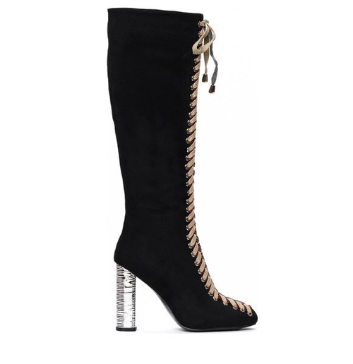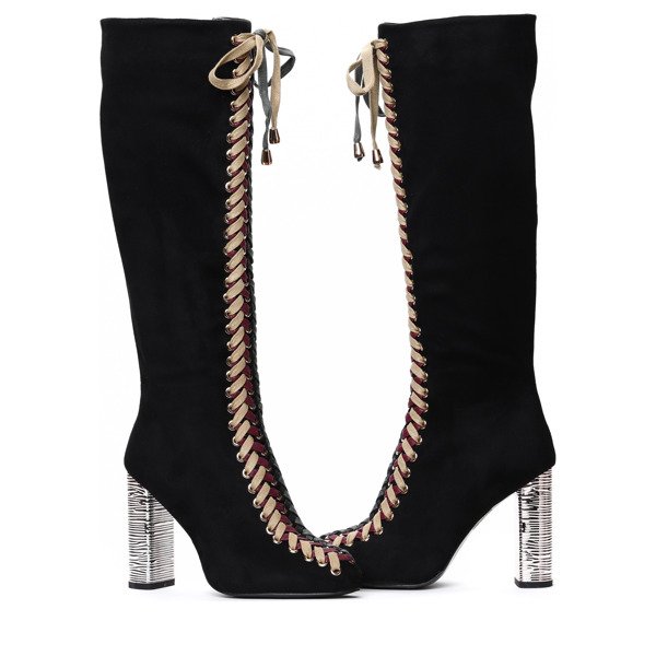 • Erstaunlich lange, mit Fell isolierte Stiefel. Steiferes Obermaterial - hat einen langen Reißverschluss und eine dekorative Bindung. Verzierter Fersenpfosten. Hoher Zeh. Das Obermaterial besteht aus ökologischem Wildleder.