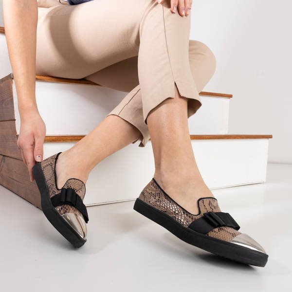 - Slip-On mit metallischer Spitze, verziert mit einer Schleife. Schuhe aus ökologischem Leder a'la Schlangenhaut. Dank ihrer klassischen Einfachheit passen sie zu vielen Outfits. HINWEIS: Das Silberelement ist möglicherweise angelaufen!