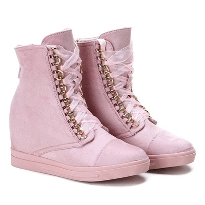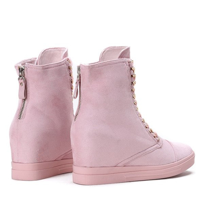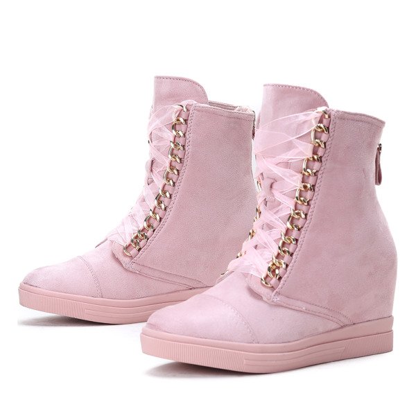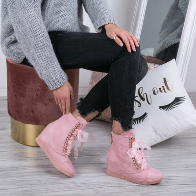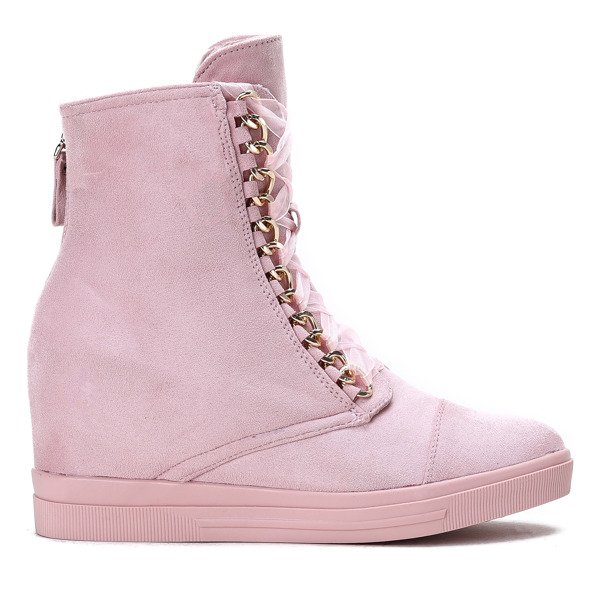 - Keil-Turnschuhe aus ökologischem Wildleder. Schuhe verziert mit einer Kette, durch die ein Band verflochten ist. Das Rückenteil ist mit einem Reißverschluss befestigt. Das Modell ist sehr komfortabel und solide verarbeitet.