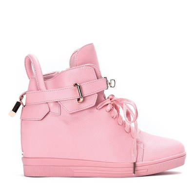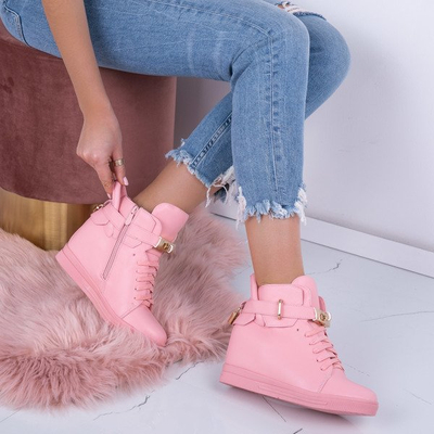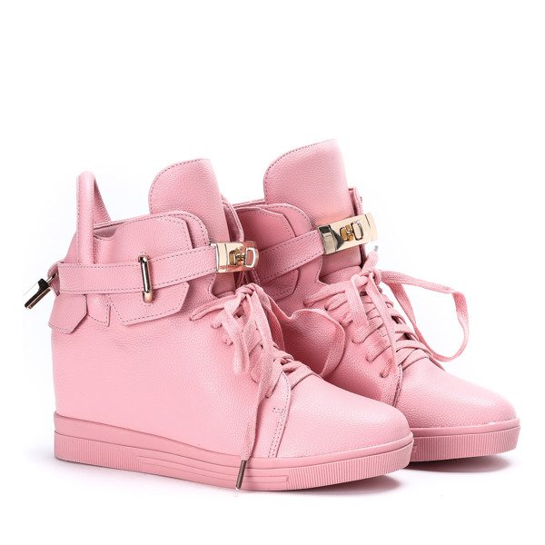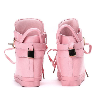 - Unglaublich bequeme Turnschuhe mit einem Innenkeilabsatz aus ökologischem Leder. Dekorativer Anhänger in Form eines Vorhängeschlosses auf der Rückseite. Modell mit Schnürung und Reißverschluss.