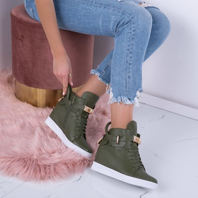 - Unglaublich bequeme Damen-Sneakers auf einem Indoor-Keil. Aus ökologischem Leder. Auf der Rückseite ein dekorativer Anhänger in Form eines Vorhängeschlosses. Modell geschnürt und mit Reißverschluss.