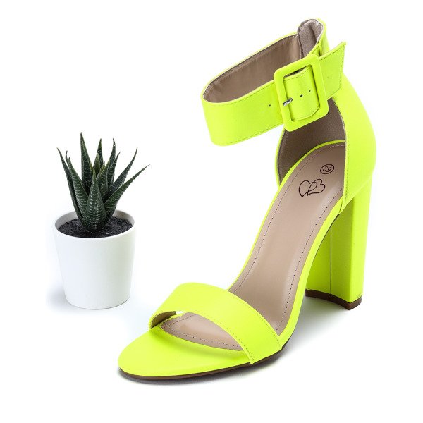 - Sandalen auf stabilem Absatz. Breiter Riemen, der am Knöchel befestigt wird. Schuhe aus Ökoleder in einer sehr modischen Farbe. Innensohle aus glattem Öko-Leder. Sorgfältig und ästhetisch verarbeitete Schuhe