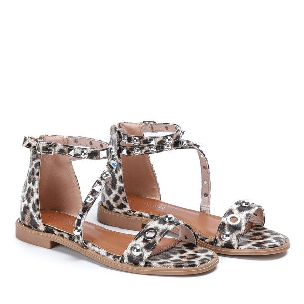 - Коричневі, літні босоніжки на плоских підборах, прикрашені леопардовим принтом. Верх виконаний з еко-шкіри та оброблений срібними аксесуарами. Модель кріпиться застібкою, а ззаду на блискавці.
