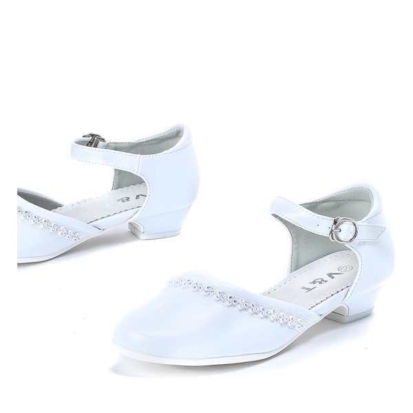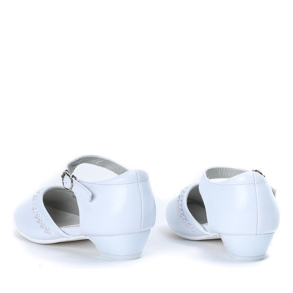 • Елегантні туфлі на низьких підборах для дівчат, виготовлені з екологічної шкіри. Біла модель. Взуття кріпиться за допомогою пряжки на щиколотці. Декоративні стрази на носі.