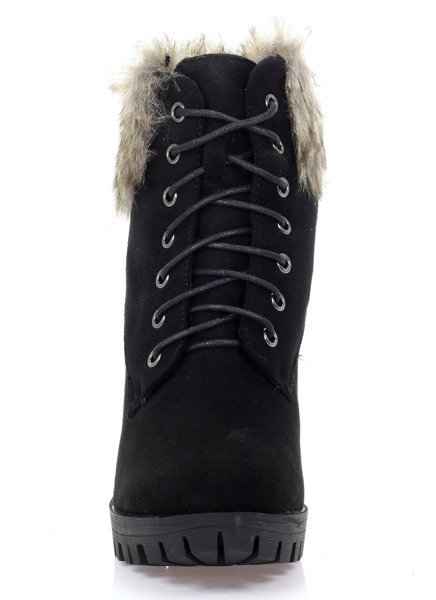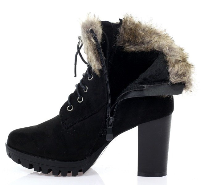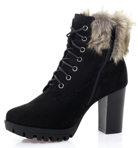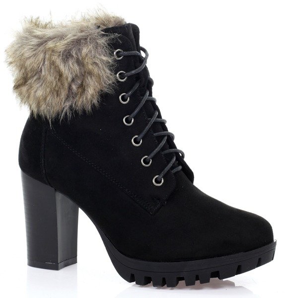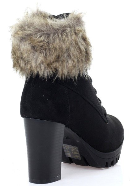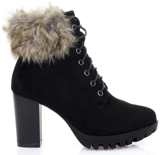 • Stylowe botki na słupku oraz platformie. Cholewka zdobiona miłym w dotyku futerkiem. Obuwie można łatwo regulować, dzięki sznurowadłom. Całość zasuwana na suwak. Idealne dla modnej kobiety !