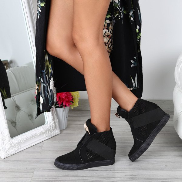 - Sportowe sneakersy wykonane ze skóry ekologicznej zamszowej. Na nosku ozdobny złoty element. Model nie posiada zapięcia, ale dzięki wszytej gumie łatwo dopasuje się do nogi.