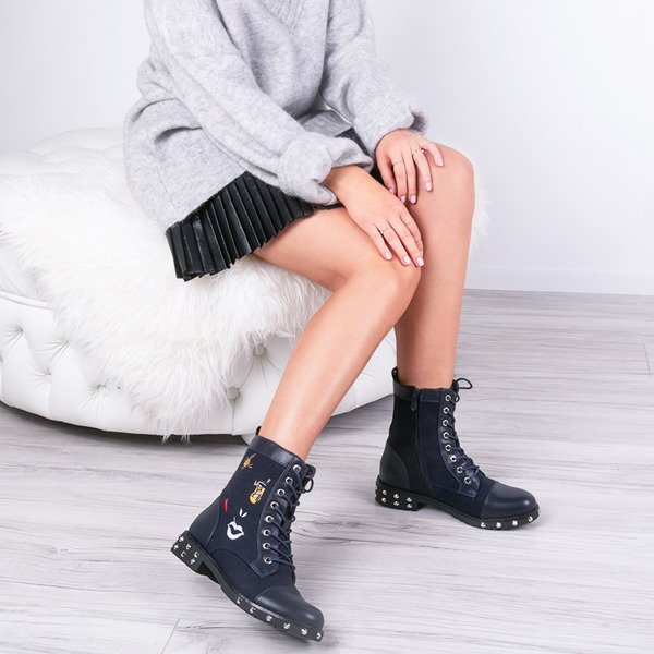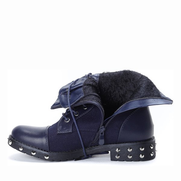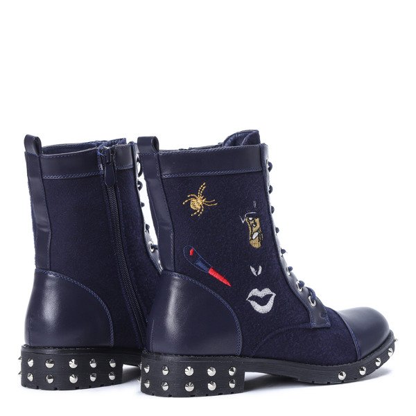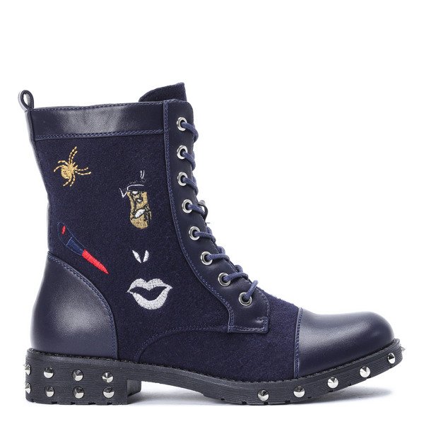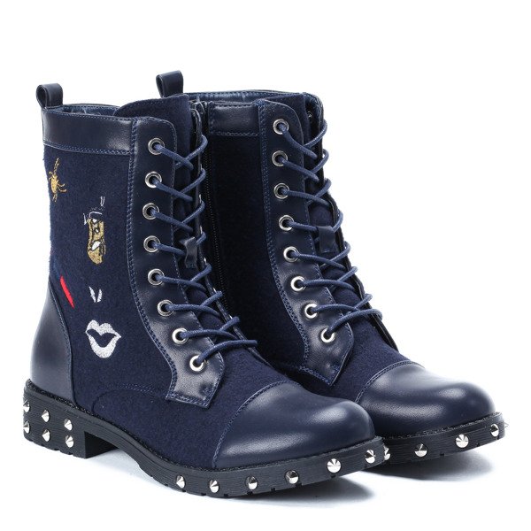 • Wysokie traperki ocieplane futrem. Zewnętrzny materiał to filc ze wstawkami z eko skóry. Cholewka zdobiona modnymi naszywkami. Podeszwa wyłożona ćwiekami- rewelacyjne połączenie!