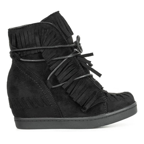 • Стильне дитяче взуття на чорному танкетці. Матеріал виготовлений з екологічної замші, а устілка покрита екологічною шкірою. Верх прикрашений бахромою. Всередині є делікатний утеплювач у вигляді пінопласту, який покритий тканиною.
