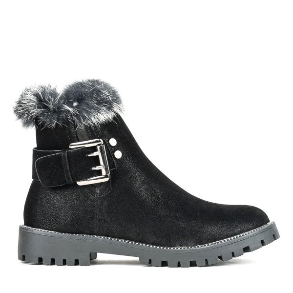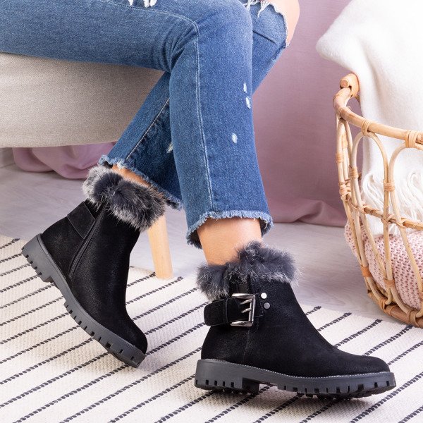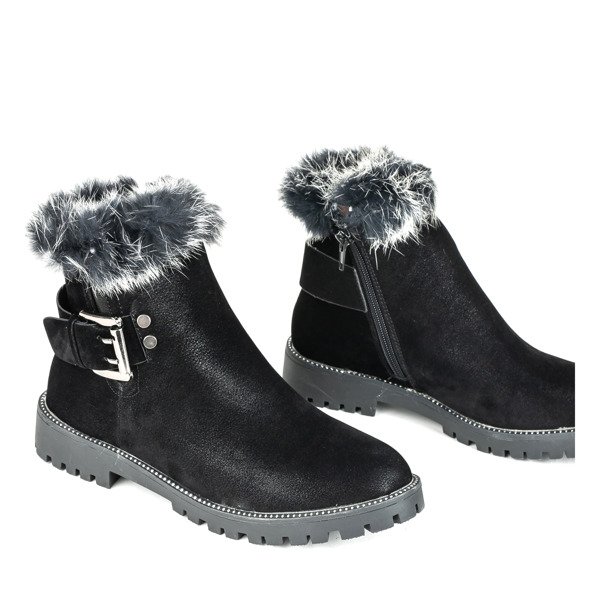 - Зручні черевики на низбкому каблуці з круглим носком. Матеріал виготовлений з чорної еко-нубукової шкіри. Середина взуття обшита тканиною. Верхня частина прикрашена хутром. Взуття має застібку-блискавку та декоративну пряжку.