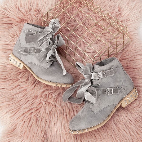 - Сірі еко-шкіряні берци на низьких підборах. Виріб має блискавку та шнурування. Додавання шипів і бантів з велюрового матеріалу робить їх унікальними. Якісно виготовлені.
