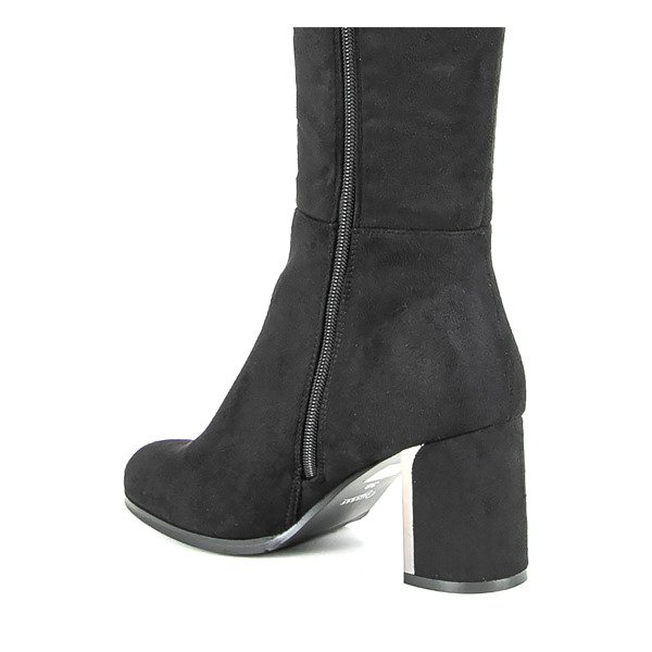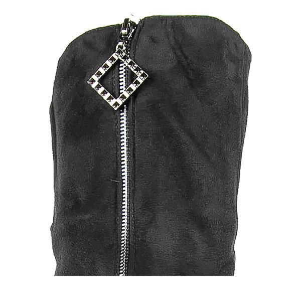 • Елегантні ботфорти, виготовлені з чорної екологічної замшевої шкіри. Модель застібається на блискавку. Всередині утеплені ніжним хутром. Каблук прикрашений металічним елементом.