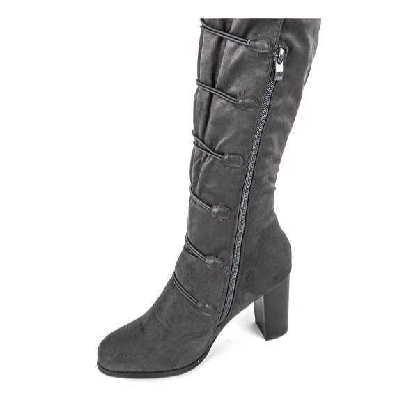 - Чудові черевики на високій стійці з верхом вище коліна. Матеріал виготовлений із сірої еко-замші. Центр трохи утеплений хутром. Жіноче взуття застібається на блискавку. Черевики мають хутряні прикраси. Ідеально підходить для холодних днів!